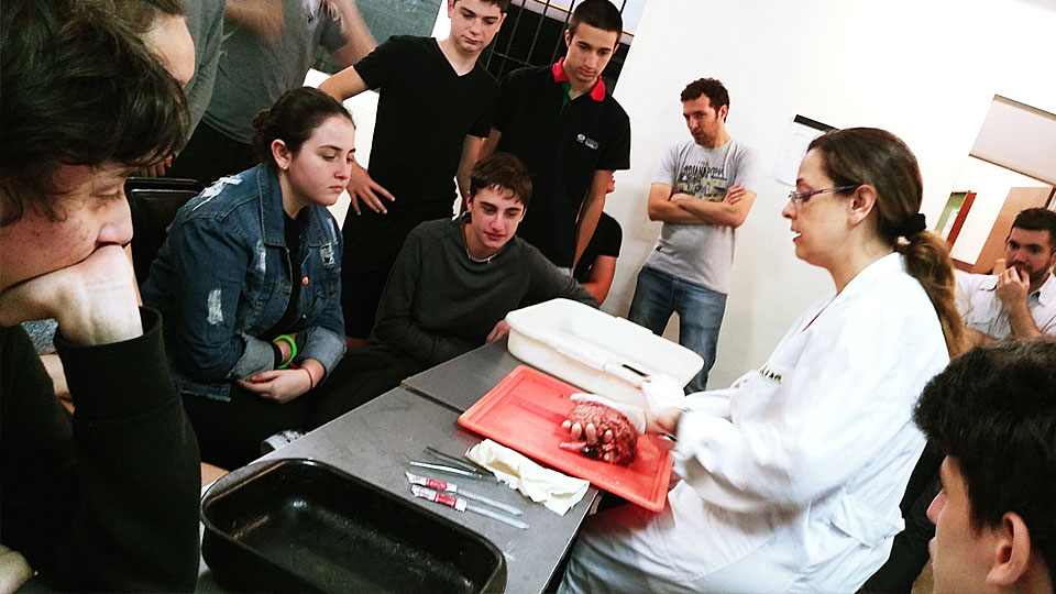 Luego de la clase teórica, hicieron en laboratorio un estudio macroscópico a nivel encefálico para lo cual realizaron una disección de un cerebro bovino con diferentes cortes e identificación de partes.