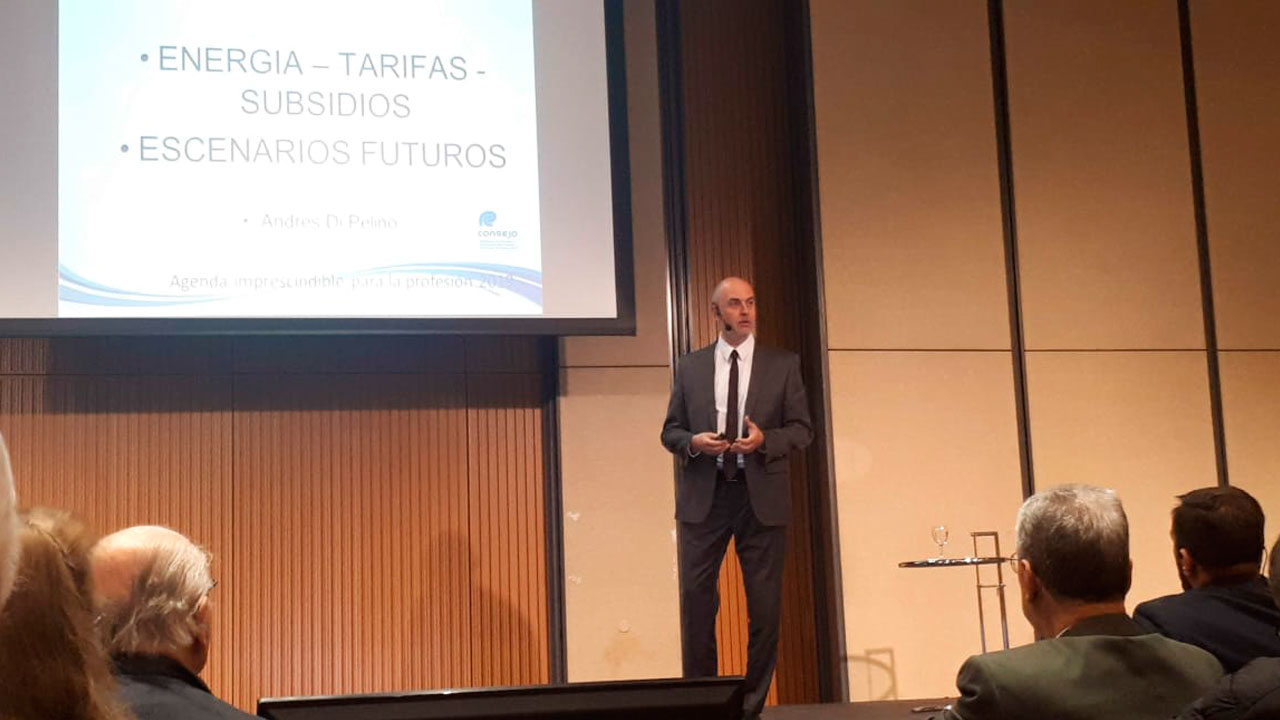El director de carreras, Andrés Di Pelino disertó en el Auditorio Belgrano, sobre “Tarifas y precios relativos. Su impacto. Escenarios”.