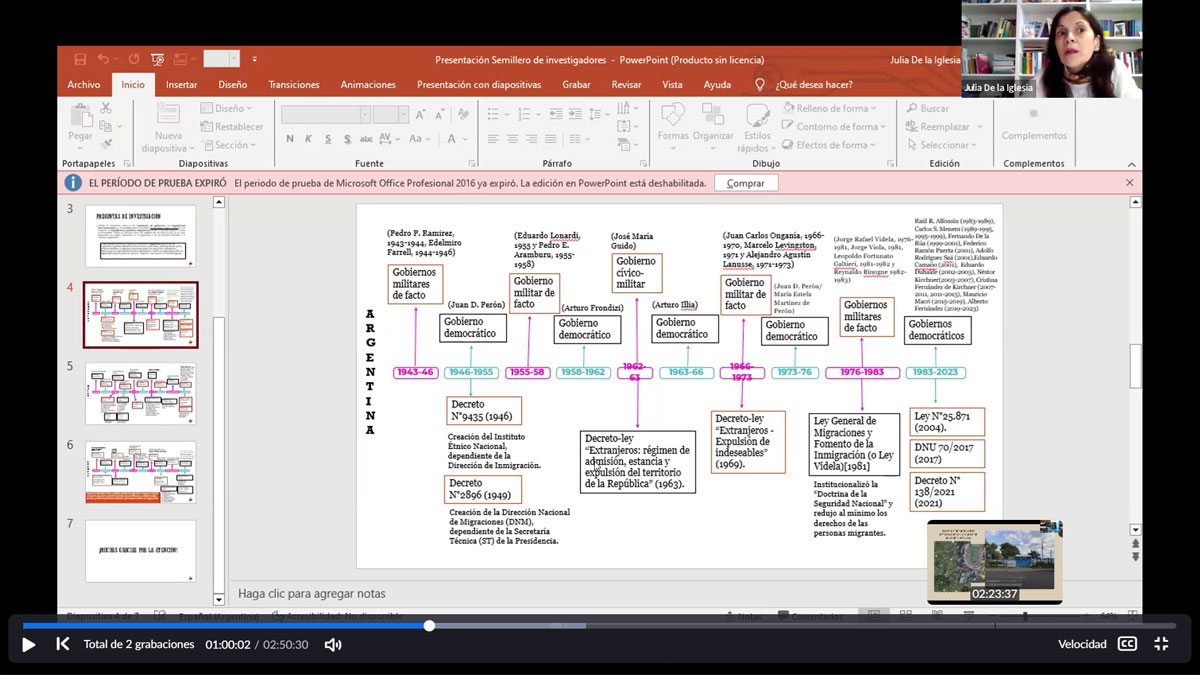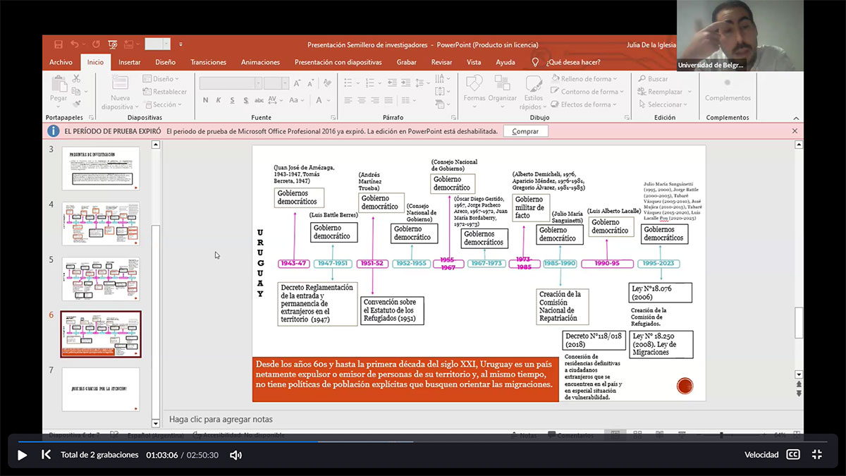 - La Universidad de Belgrano (UB) participó con la presentación de avance del proyecto "Interacciones entre regímenes de gobierno, organismos estatales, legislación y políticas migratorias. Un análisis a partir de los casos de Argentina, Uruguay y Chile (1945-2023)”.